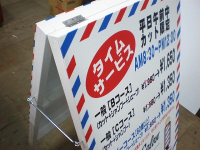 本体は既存のものを利用し、安価なパネルサインにしております。表示面は屋外用塩ビ+インクジェット出力+UVラミネート加工です。